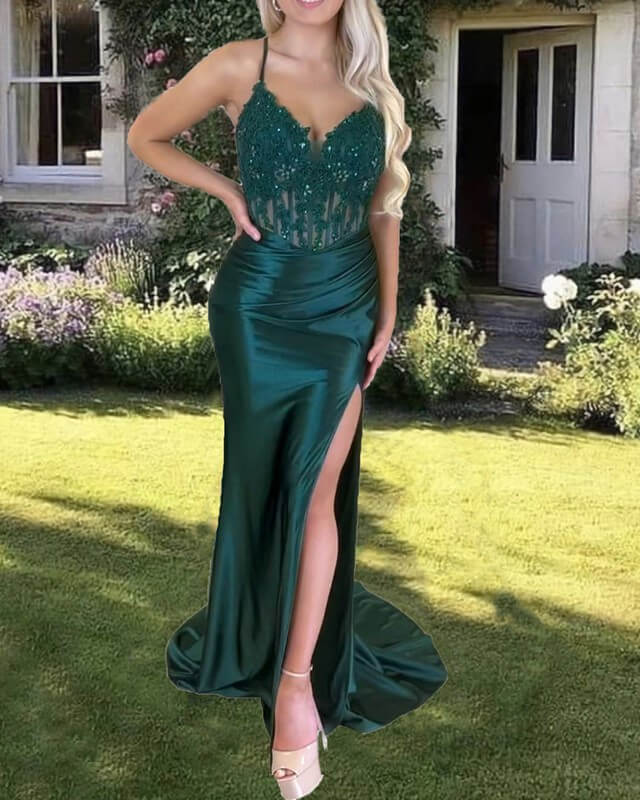 Source : s.click.aliexpress.comGreen Satin Mermaid Cross Back Split Dress โ Lisposa